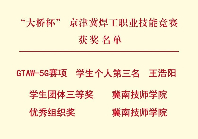近日,2025年度 “海河工匠杯” 职业技能大赛—— “大桥杯” 京津冀焊工职业技能竞赛圆满落幕。我院教师刘鹏良指导的2025级技师机修二班学生王浩阳,在学生组GTAW-5G赛项中沉着应战、稳定发挥,凭借扎实的专业功底与精湛的操作技艺,荣获第三名。同时,我院凭借出色的赛事组织与专业的服务保障,被授予“学生团体奖”与“优秀组织奖”,充分彰显了学院在高技能人才培养与产教融合方面的扎实成效。