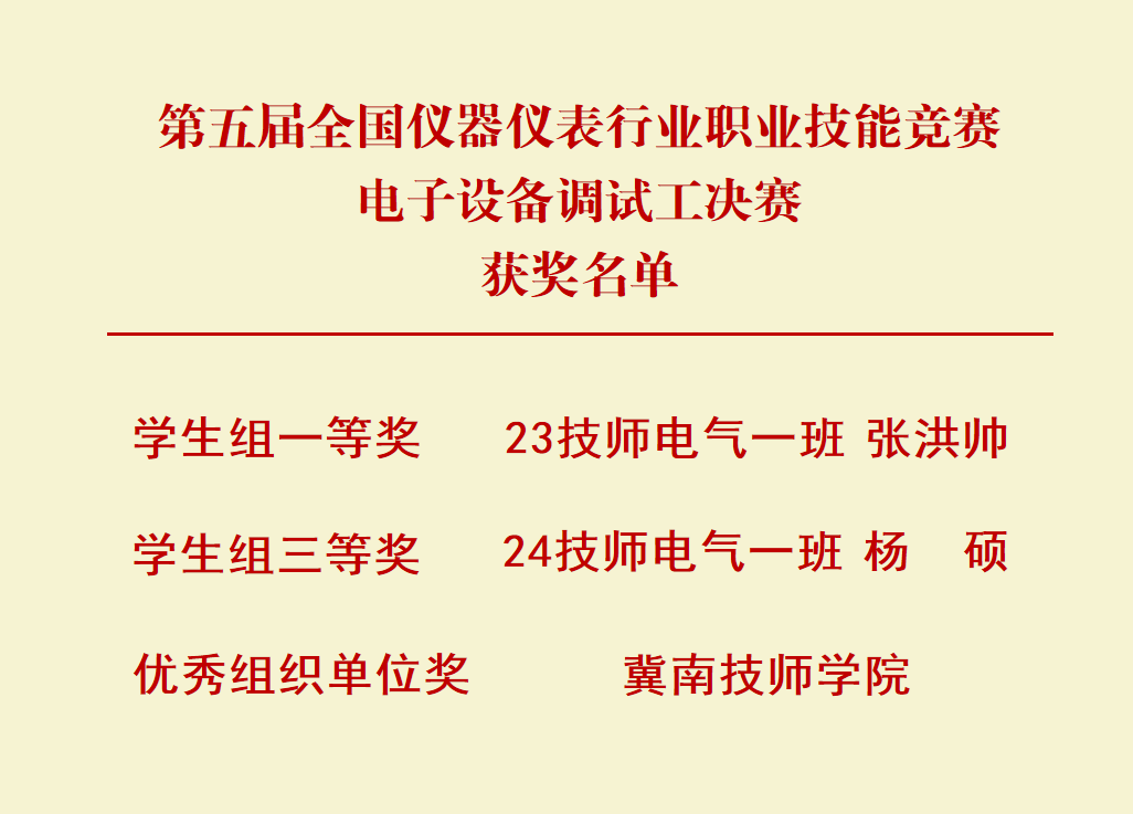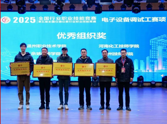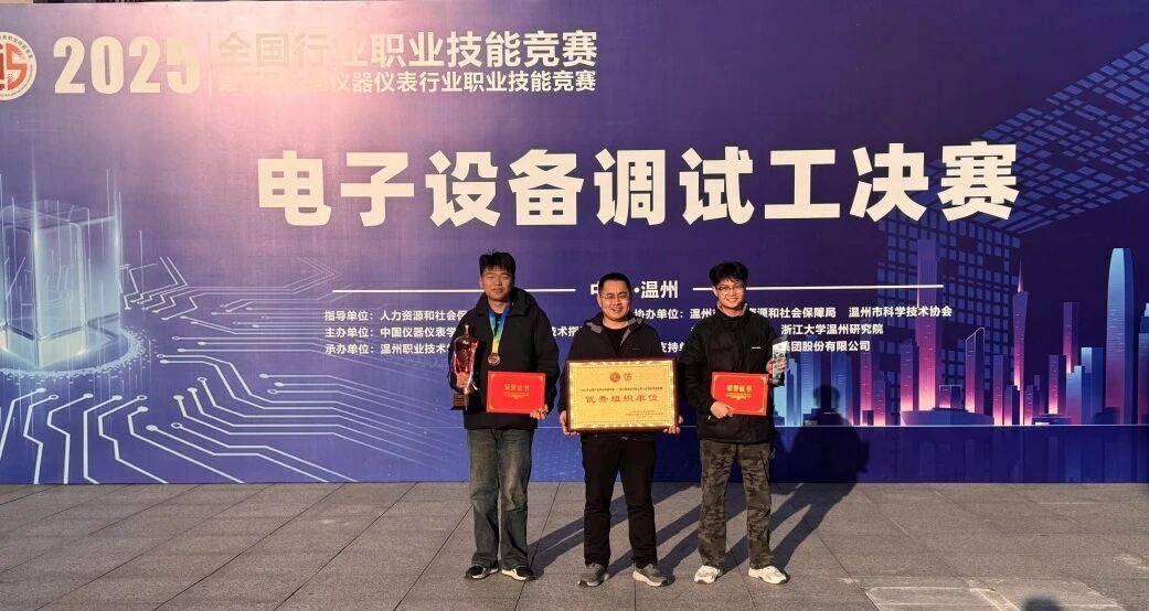 近日,2025-2026年全国行业职业技能竞赛——第五届全国仪器仪表行业职业技能竞赛电子设备调试工决赛在浙江温州圆满落幕。我院智能控制工程系学生组选手张洪帅、杨硕凭借扎实的专业功底与精湛的技艺,经过激烈⻆逐分别荣获一等奖(铜牌,第三名)与三等奖(第九名)。同时,我院被授予“优秀组织单位奖”,充分彰显了我院在高技能人才与产教融合方面的扎实成效。