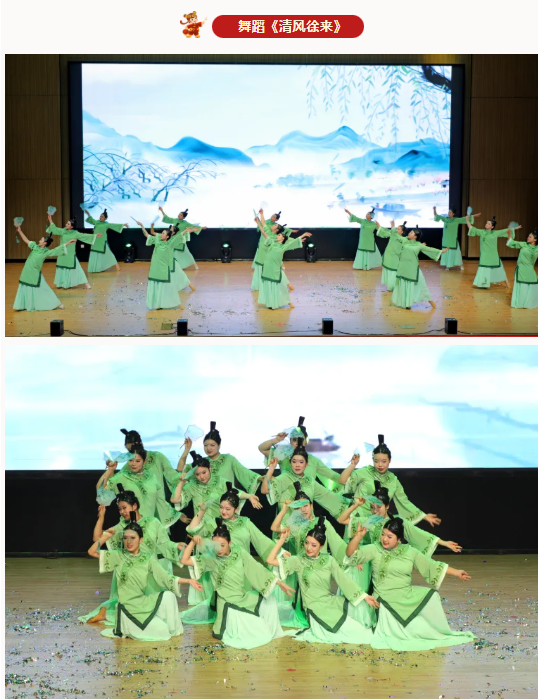 清风徐来润桃李,匠心育人树新风。看舞台中央那抹灵动青绿:学子们身着雅致汉服,水袖轻旋、身姿舒展,把国风韵律跳成青春的模样,一帧帧都是少年们的诗意巧思。