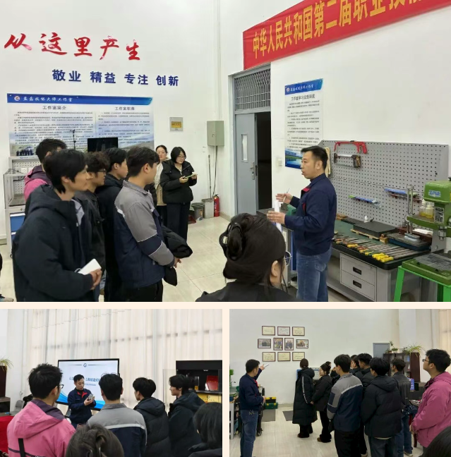随后,孟磊老师带领学生们走进工作室,先后参观实训区、成果展示区。在实训区,孟磊老师详细介绍了每台设备的功能和操作要点,现场演示了部分精密加工操作,让同学们对实际生产加工有了更直观的认识;成果展示区里,一件件造型精美、精度极高的工件吸引了大家的目光,孟磊老师讲述了这些作品背后的设计理念、加工难点以及团队协作的故事,让同学们真切感受到了“精益”二字的千钧分量;荣誉墙上,挂满了孟磊老师及其团队获得的各类奖项和荣誉证书,同学们驻足凝视,从沉甸甸的荣誉里,看到了工匠们在平凡岗位上创造不凡的奋斗足迹。