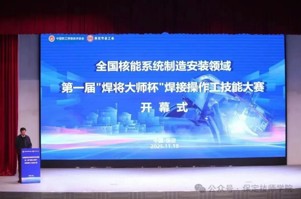 11月19日,全国核能系统安装制造领域第一届“焊将大师杯”焊接操作工技能大赛在保定技师学院(保定工匠学院)盛大开幕。此次大赛由中国职工焊接技术协会、保定市总工会联合主办,中国核工业二三建设有限公司、中国职工焊接技术协会焊接设备应用专委会、中国职工焊接技术协会职业教育专委会、保定技师学院(保定工匠学院)承办,冯英超劳模工匠人才创新工作室、张宏伟劳模工匠人才创新工作室协办,中核高效智能化焊接重点实验室、山东奥太电气有限公司、四川大西洋焊接材料股份有限公司为大赛提供大力支持。