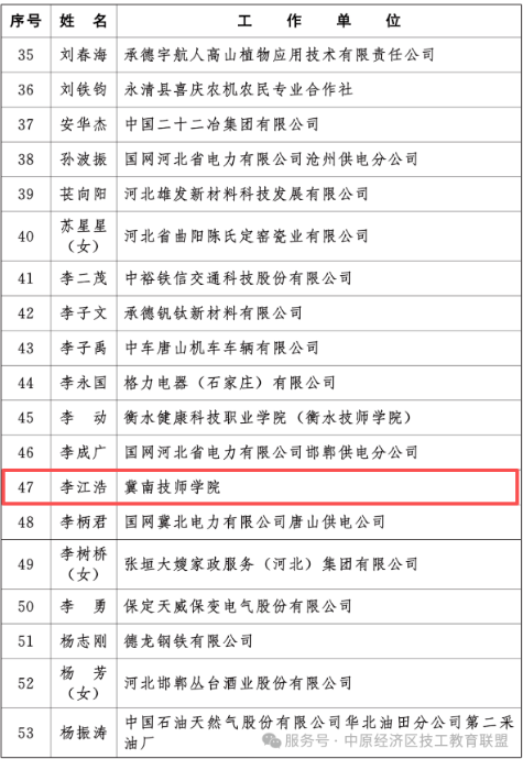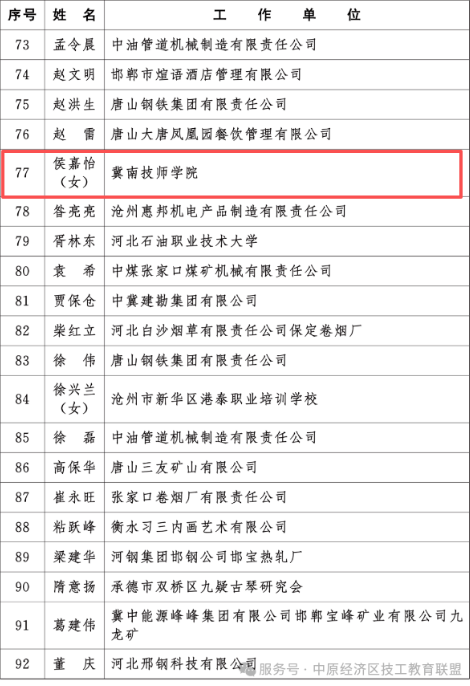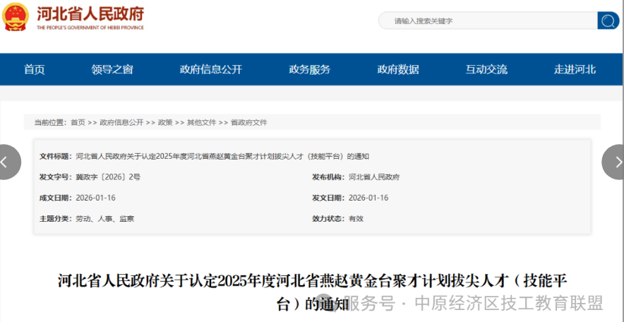 近日,河北省人民政府发布《关于认定2025年度河北省燕赵黄金台聚才计划拔尖人才(技能平台)的通知》(冀政字〔2026〕2号),学院李江浩、侯嘉怡两位教师凭借深厚的专业功底、卓越的技能水平和突出的育人成效,成功获评“河北省燕赵黄金台聚才计划拔尖人才(技能平台)”,自认定次月起将享受省政府工作津贴及相关待遇。这一荣誉不仅是对两位教师个人能力的高度认可,更是学院深耕技能人才培养、助力区域产业发展的生动体现。